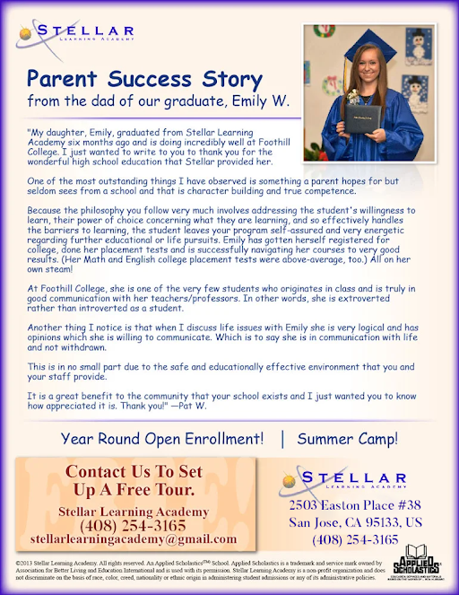 I cannot begin to tell you what a pleasure it is to have my two children attend Stellar Learning Academy. The school is a very friendly, caring, and respectful environment where my children get an excellent education. They are thoroughly taken care of. Their interests in different areas of life are included in their curriculum. They also have the benefit of progressing at their own speed, which is another advantage. Everything they study, they know because they are never given a pass on something they don’t have 100 percent. To me, that is such a vital point! Education is for knowing, and that’s what Stellar provides for our children. I am very, very grateful to the school and the staff at Stellar. I know my children are getting their education for LIFE in a wonderful environment, and as a parent, I couldn’t ask for anything more! Thank you so very much!